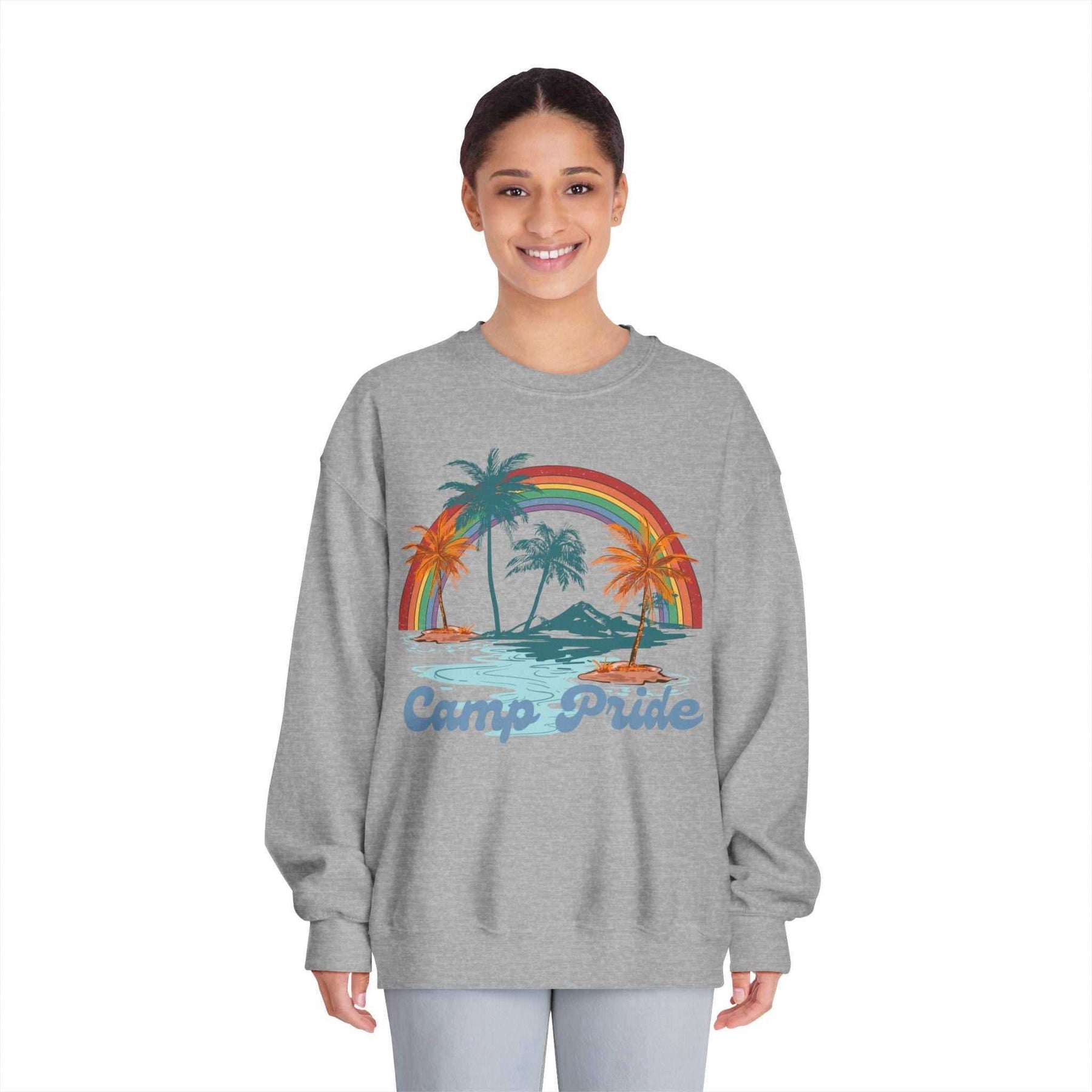 Etsy's Camp Pride Crewneck Sweatshirt is the ultimate summer vibe beachwear for anyone wanting to show off their LGBT Pride. This unisex apparel makes a perfect gift for friends, showcasing a blend of comfort and style. Available in Ash, Sport Grey, and White colors, in sizes S to 3XL, this sweatshirt boasts quality construction and a vibrant design. Whether you're lounging by the shore or attending a Pride event, this LGBT Pride Sweatshirt is a standout piece that exudes positivity and inclusivity. Stand out in style with this unique and trendy piece from Etsy.